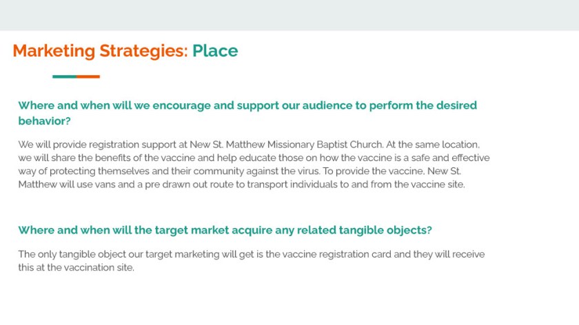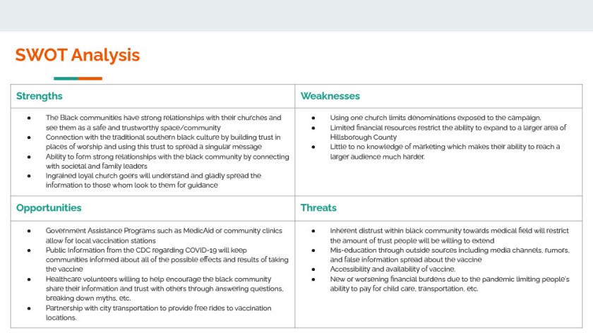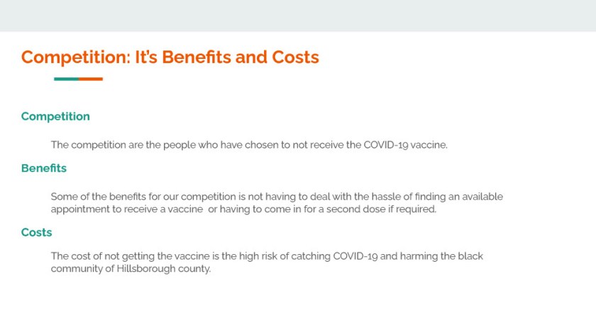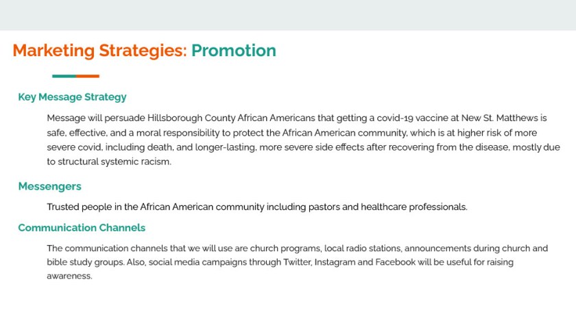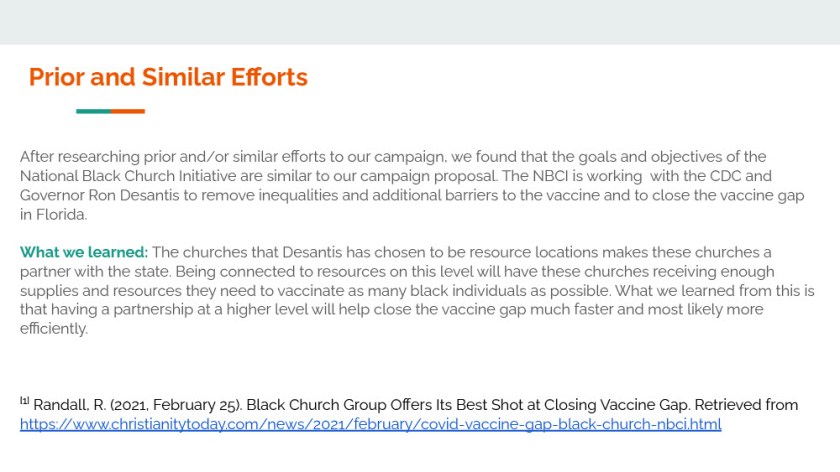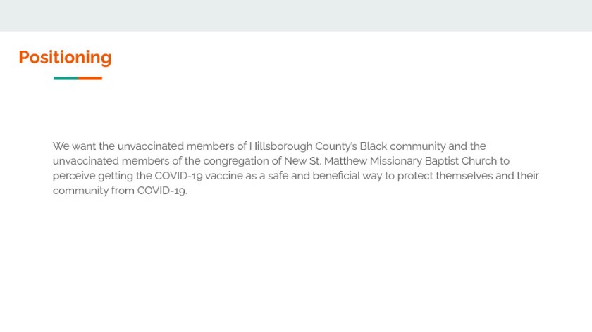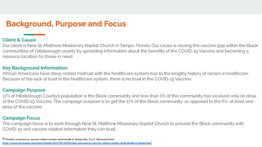 We decided to reach out to New St. Matthew Missionary Baptist Church, which is located in Hillsborough County, in an attempt to work with them. Our cause is to help close the vaccine gap within Black communities in Hillsborough County by spreading information about the COVID-19 vaccine and becoming a resource location for those in need.